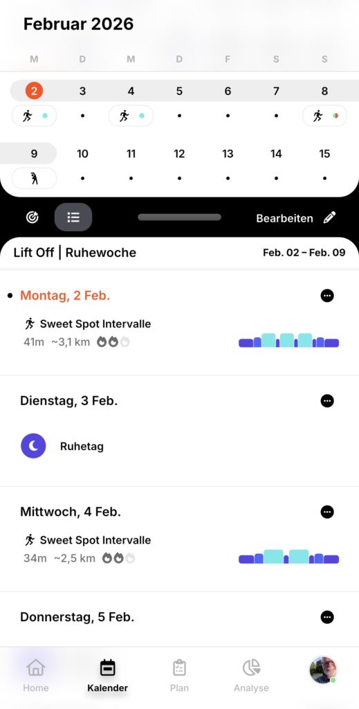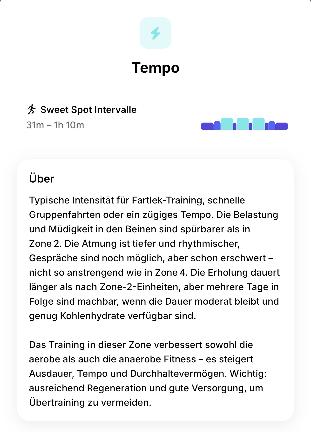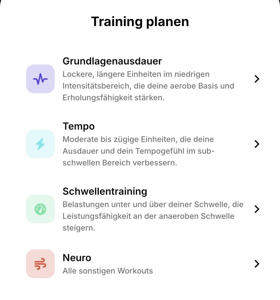 7. sodann kommt man zur eigentlichen Planung. Hier gilt zu beachten, dass nur Trainingseinheiten angeboten werden, die zum aktuellen Plan passen. Ich entscheide mich für „Tempo“