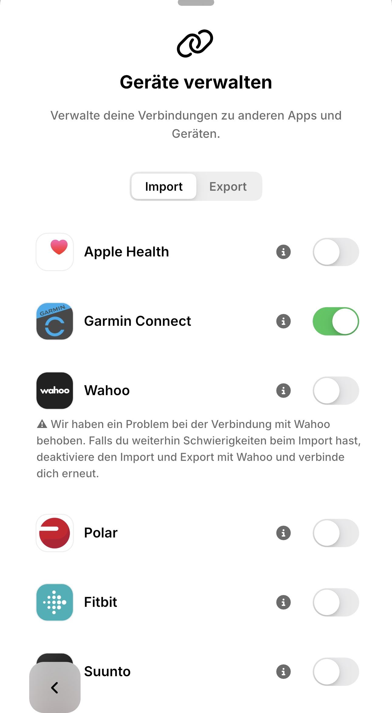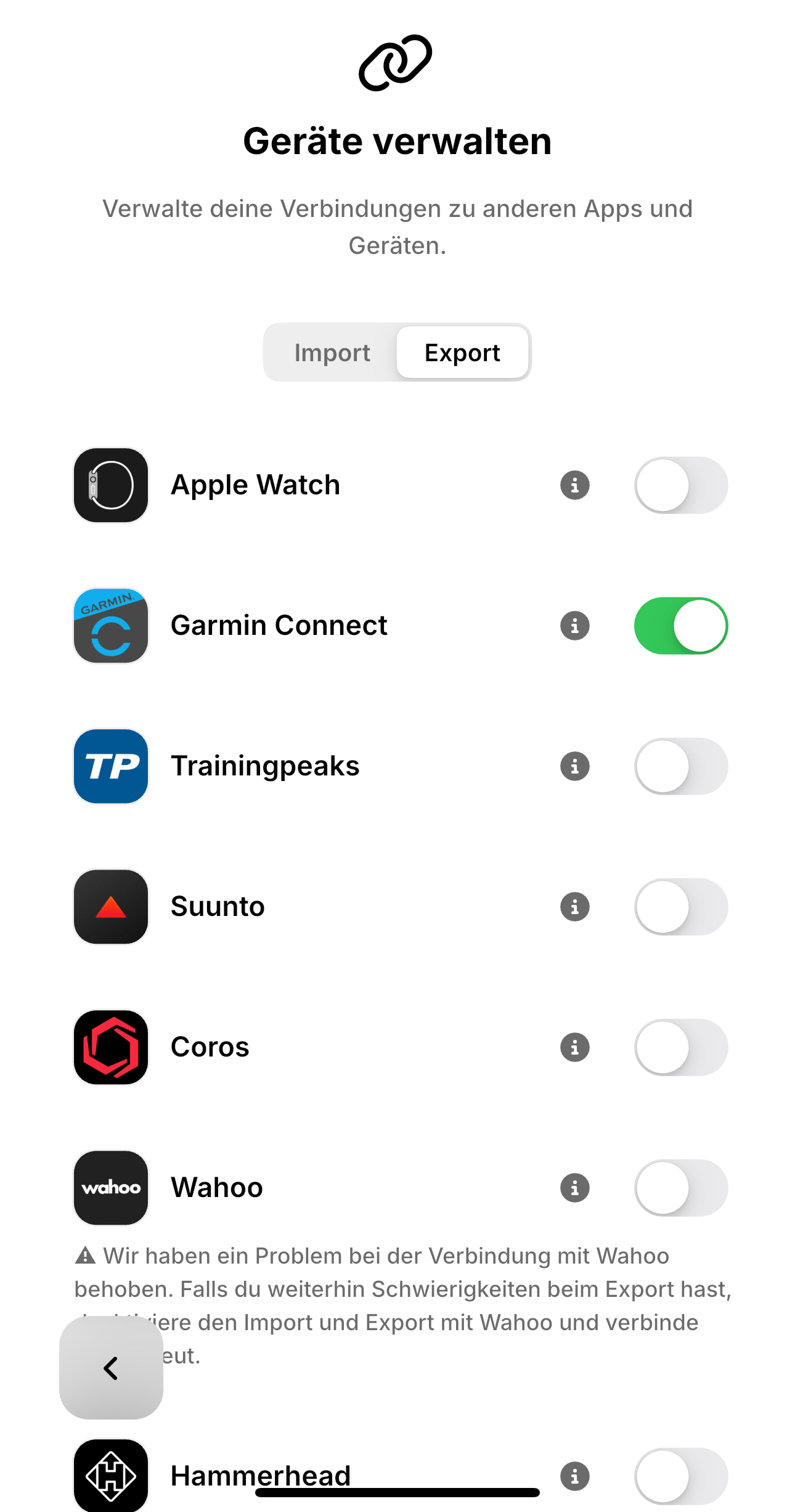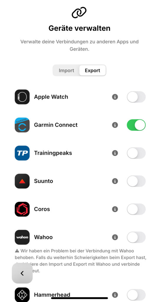 - in Garmin Connect kann man unter „Mehr“, „Einstellungen“, „Verknüpfte Apps“, „enduco“ die Verküpfung sehen, Einstellungen vornehmen und bei Bedarf auch wieder kappen.