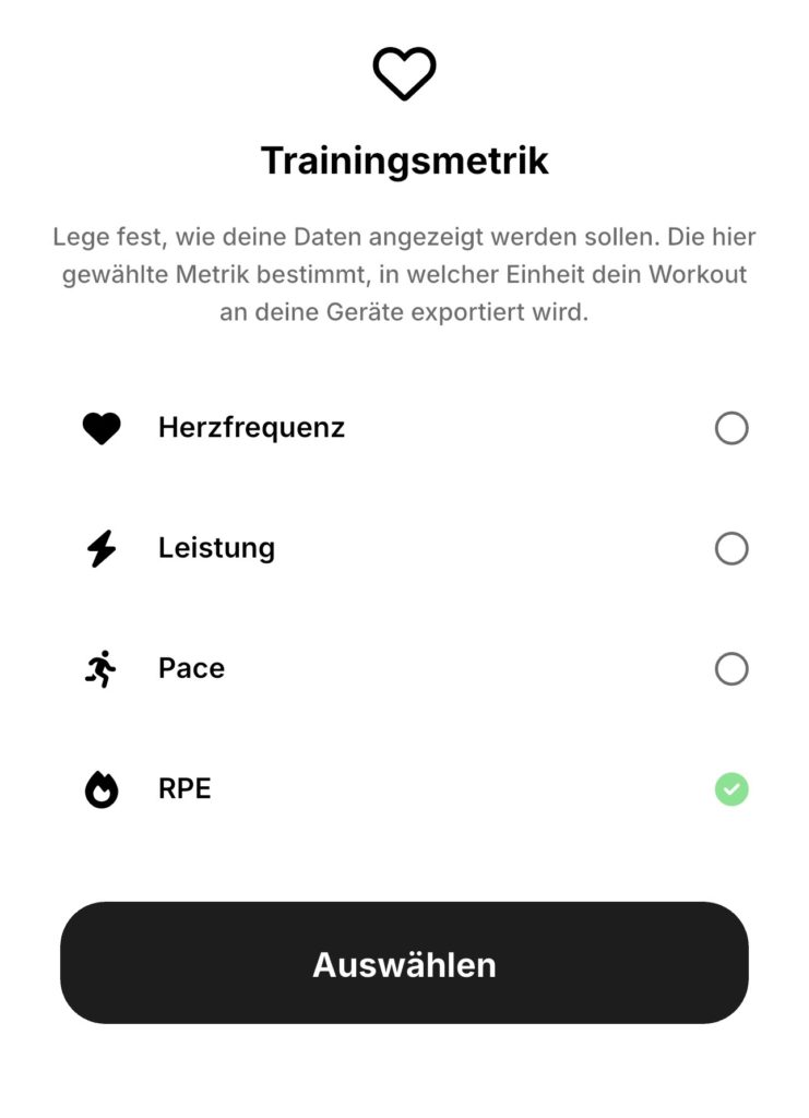 Für den Export zu Garmin ist es wichtig nicht RPE auszuwählen.