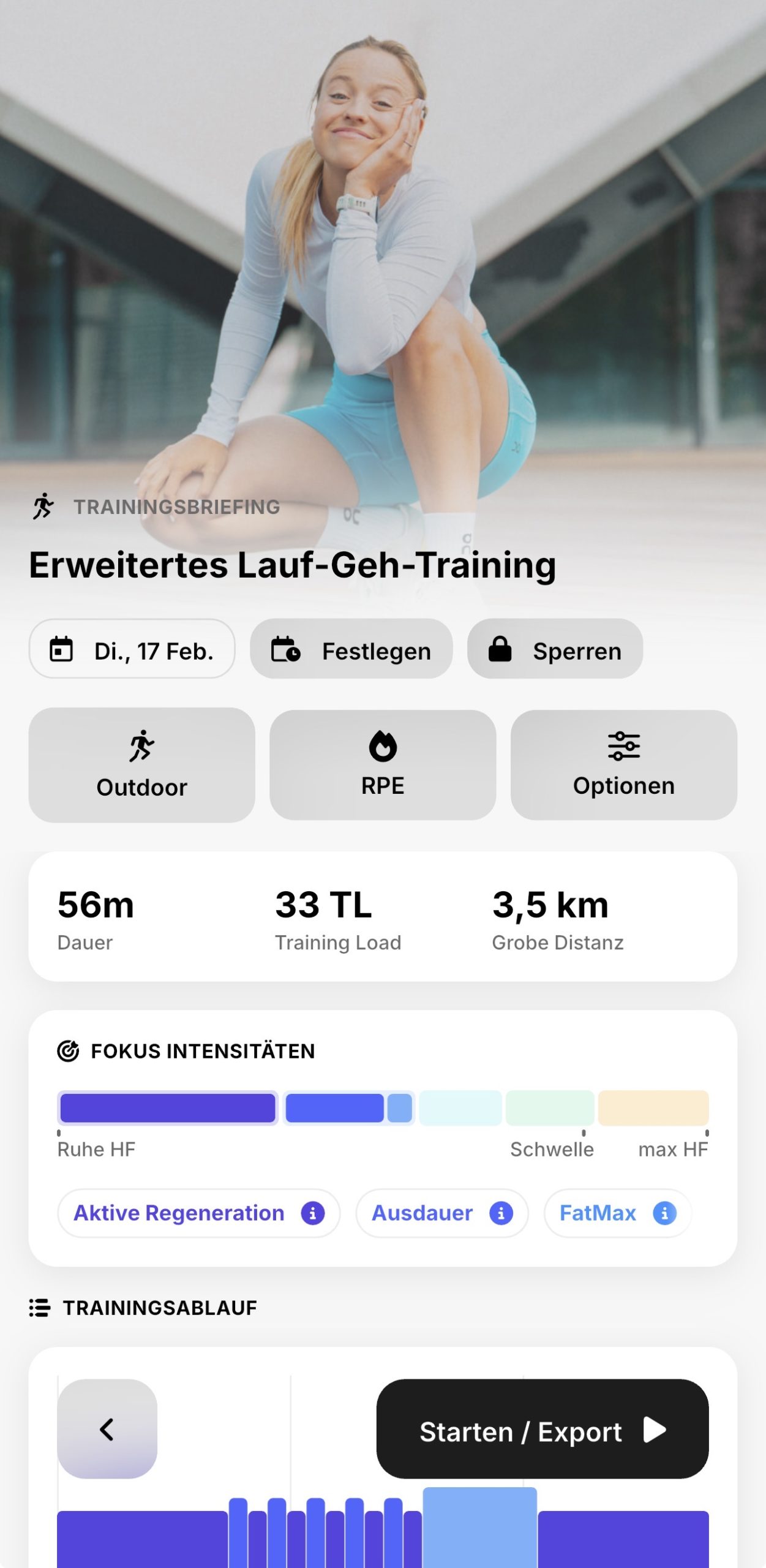 Dazu geht man zum gewünschten Trainingsplan und widmet sich den drei großen Schaltflächen in der Mitte des Bildschirms.