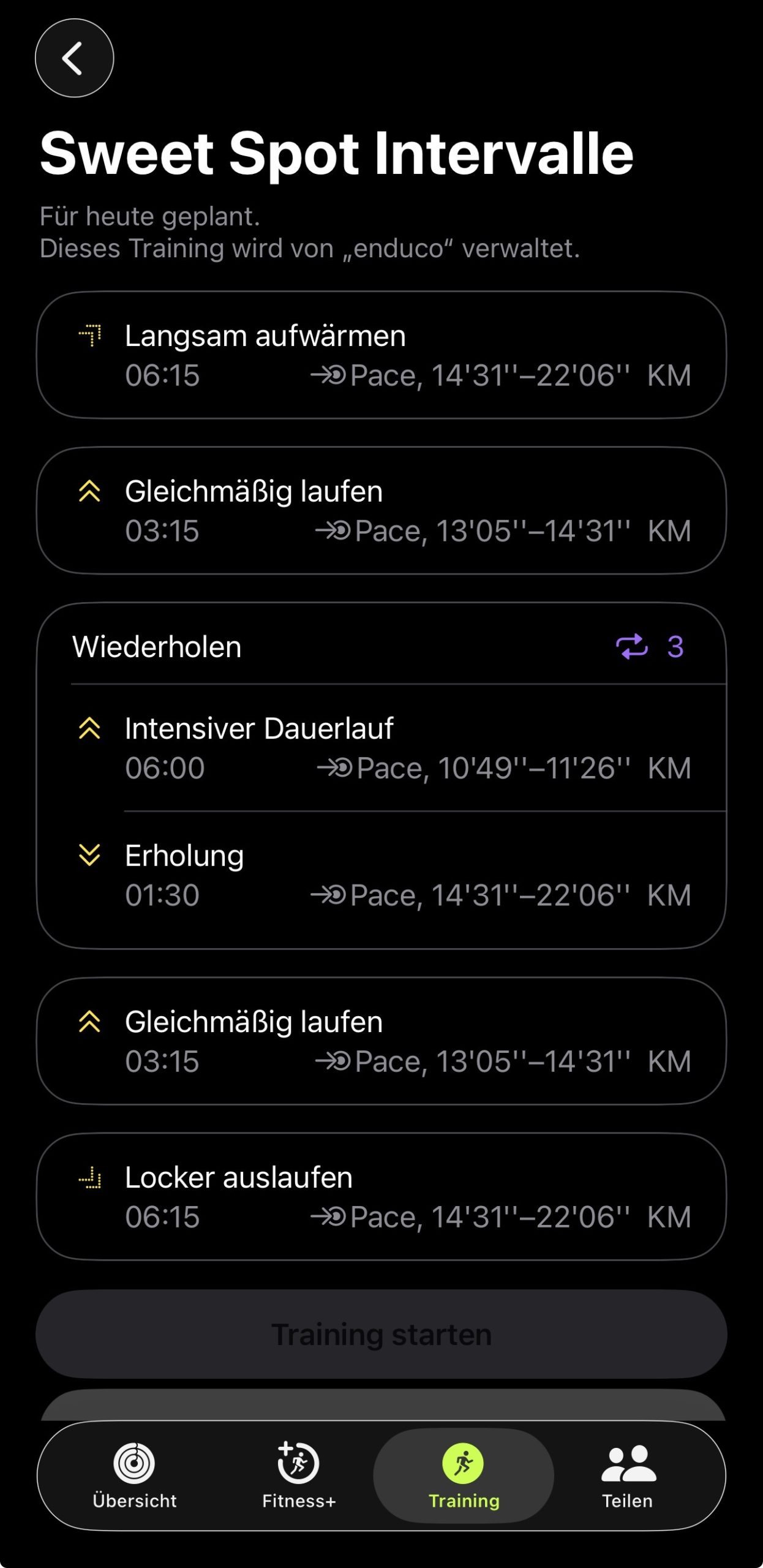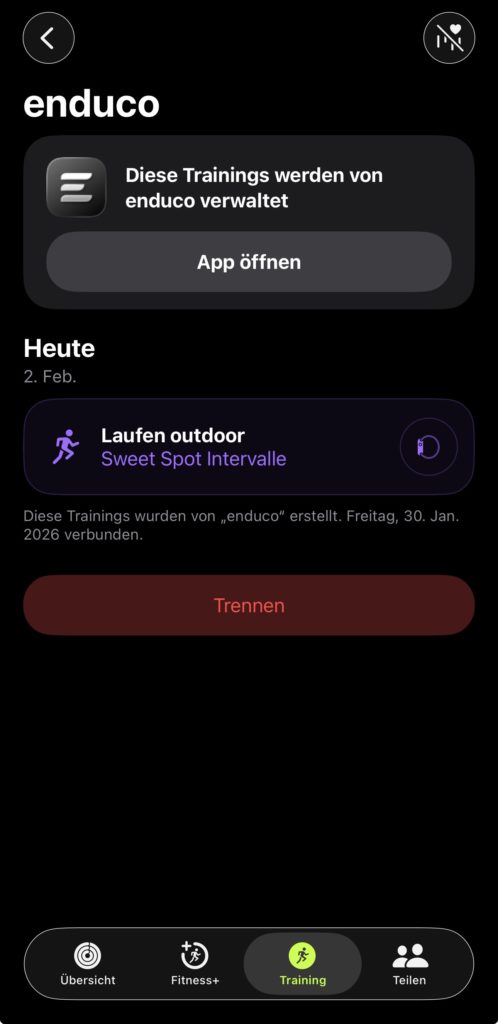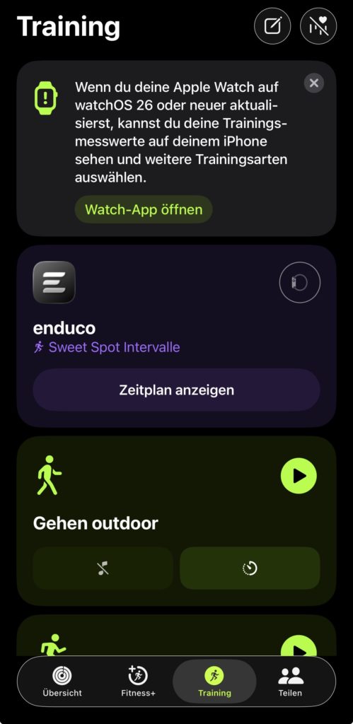 5. in der Fitness-App auf dem iPhone wählt ihr den Eintrag „Training“ und dort seht ihr jetzt das Enduco-Training