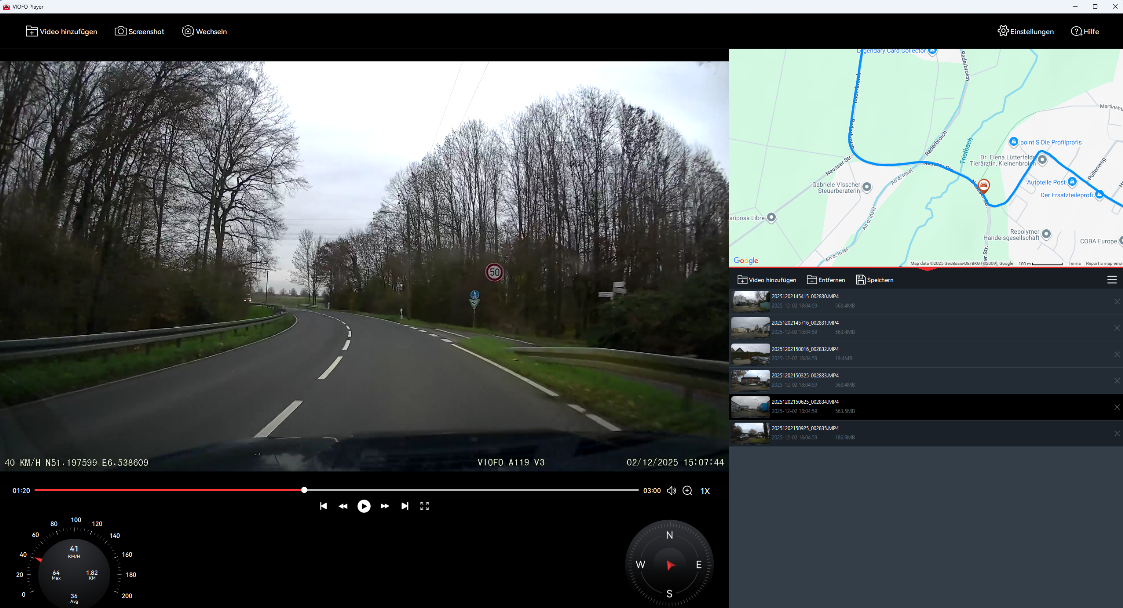 Bisher habe ich mich tatsächlich bei Abspielen der Videos immer mit der freien Version des Dashcam Video Viewers (nur zwei Clips gleichzeitig) beholfen. Doch jetzt bin ich tatsächlich durch Zufall fündig geworden, denn VioFo hat seit einiger Zeit einen eigenen Player herausgebracht. Und dieser Player kann sich mehr als sehen lassen.
