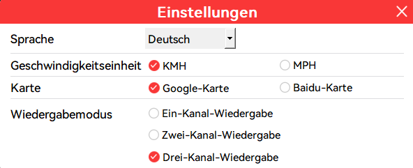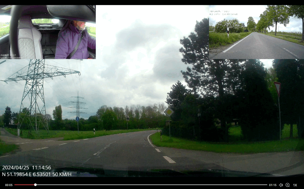 Die Einstellungen der Software beinhalten alles, was man benötigt. Zudem bietet diese Software auch die Abspielmöglichkeit von mehreren Sichtwinkeln. Das heißt, zwei oder drei Kameras lassen sich gleichteitig abspielen, also z.B. Front und Innen oder Front, Innen und Rückansicht. Die Dateinnamne müssen nur gleichlauten und nur am Ende eine entsprechende Kennung haben.